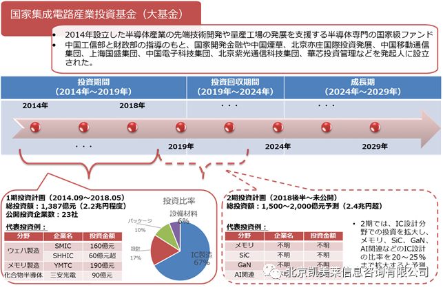 大基金は設立して以来、ウェハ製造、メモリ製造、化合物半導体、SiC、AI関連などさまざまな半導体関連分野で投資活動を行い、2014年~2018年5月まで総投資額1,387億元(2.2兆円程度)により、公開で投資した企業数が23社となった。