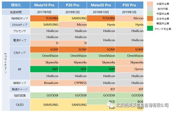 これまでHuaweiに携帯電話部品を提供してきたサプライヤー(表1)から見ると、米国サプライヤーはHuaweiの主要な海外パートナーであることが分かる。しかし、2019年前半、Huawei創業者の任正非氏はインタビューで、米企業の供給の比重を減らしていくことを表明した。さて、今回発売したMate30シリーズの主要サプライヤーはどのように変化したのだろうか?