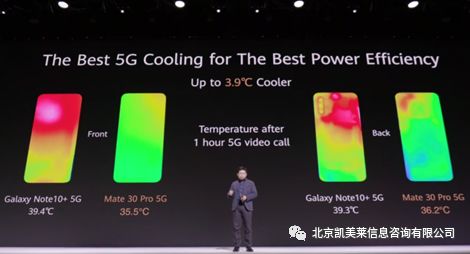 ダウンロード速度についても、発表会でライバルと比較する動画が公開された。Mate30 Proの 5G通信速度は4Gの25倍で、Samsung Galaxy Note10+5Gより50%速いことが分かる。5G 状態の電池時間と冷却性能について、発表会で公開した比較データによると、Samsung Galaxy Note10+5Gの電池時間はわずか6時間、それに対して、Huawei Mate30 5Gは8.2時間、Mate30Pro 5Gは9.2時間に達した。1時間の5G ビデオ通話をした後、Samsung Galaxy Note10+5Gの前後の機体の温度と比べ、Huawei Mate30 pro 5Gが3℃程度低いことが分かる。